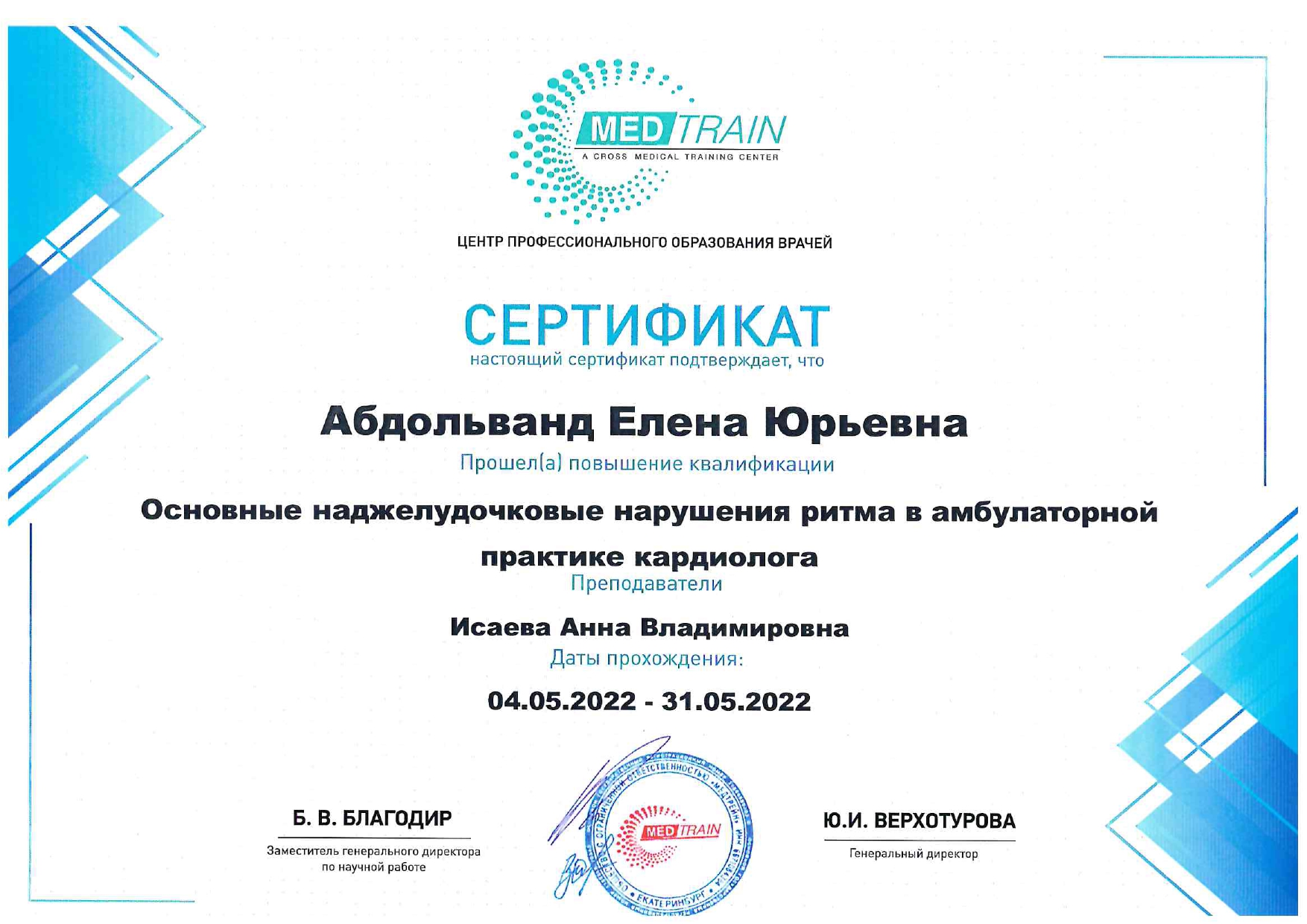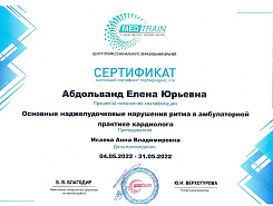 Хочу выразить благодарность кардиологу Абдольванд Елене Юрьевне. Очень понравился доктор, приятная, внимательная, изучает проблему со всех ракурсов, не торопится с назначением кучи сильнодействующих лекарств. Дала рекомендации, что принимать и сколько, всё понятно и доступно.