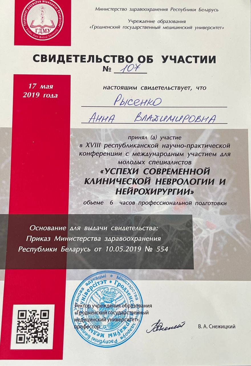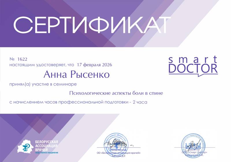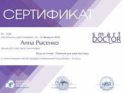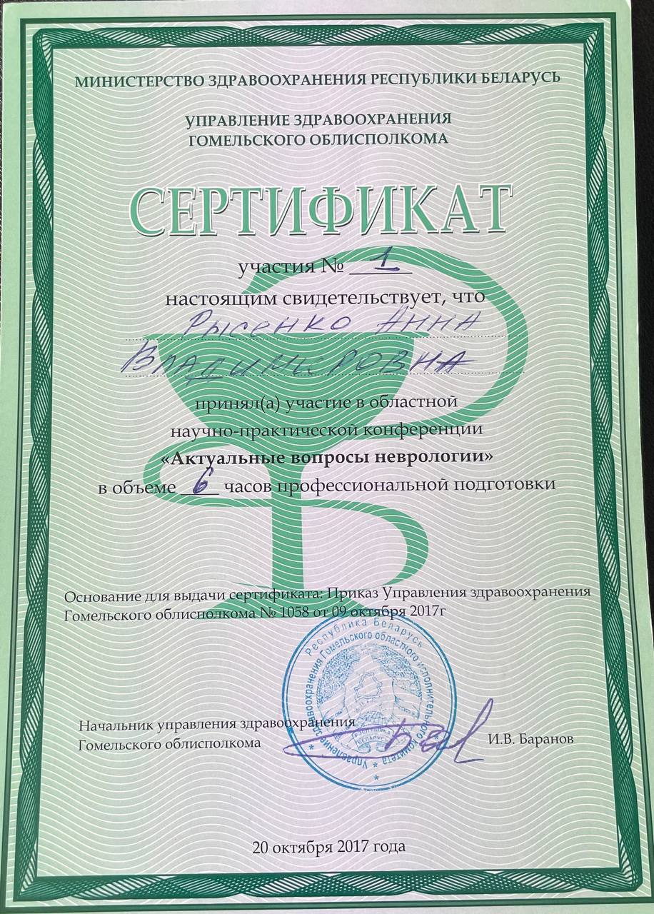 Обращался на прием к неврологу Рысенко Анне Владимировне с дикой болью в пояснице. Врач все выяснила, задавала наводящие вопросы, провела осмотр с учетом острой боли. Выписав препараты, объяснила, что и зачем нужно, а главное, как будет работать. Сама Анна Владимировна понравилась, внимательна к пациенту. Не пожалел, что записался именно к ней.